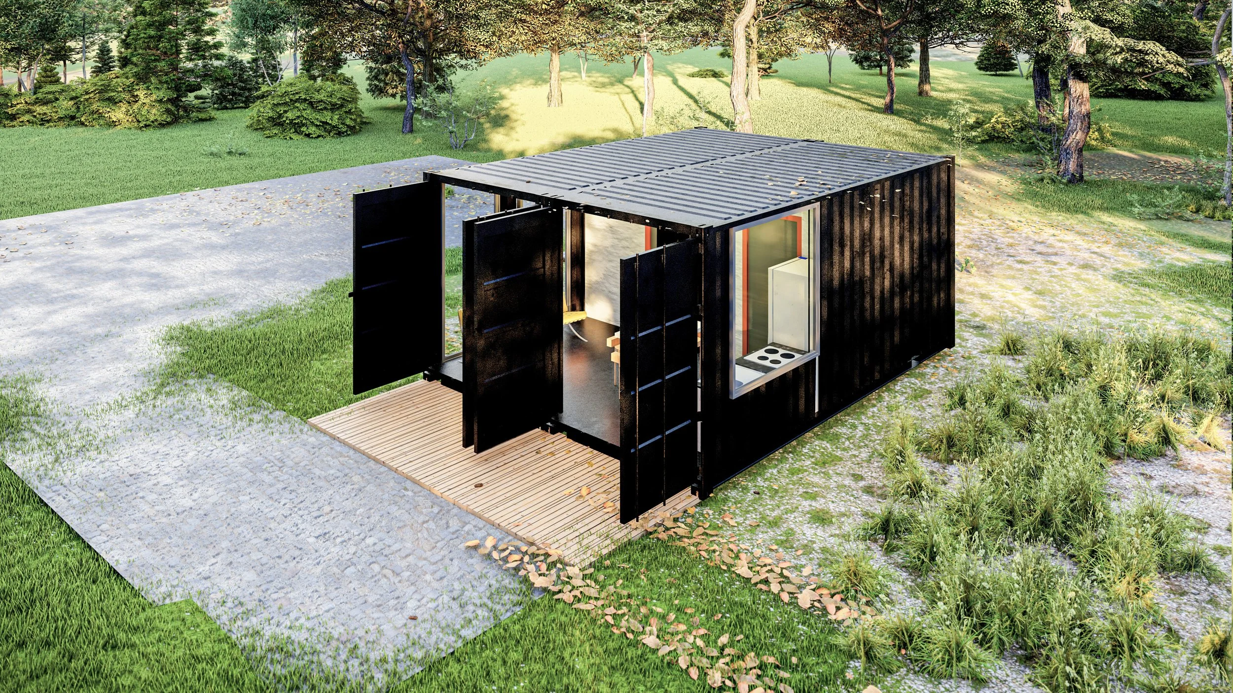 Our 520 sq-ft, midlevel model utilizes a two-story, slim design. 2 bedroom floorplan with a walkout deck from the upstairs Master. Functional cargo doors create an incredibly open feeling to this tiny home. Built-in audio/video system for space savings that is viewable from your patio. Detached garage options available. Truly “bigger on the inside” with high 9ft ceilings and space savings design integration. The walk-out deck can be enclosed for an all-season room adding significant square footage all year round. Optional “double wide” for 1080 sq-ft plus double the walkout deck. Builder financing available.